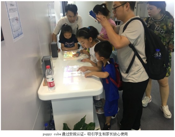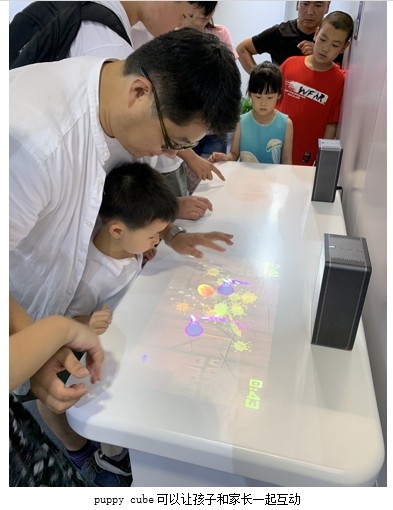 puppy cube光影魔屏采用超短焦投影技术,在桌面上投射出的23英寸屏幕分辨率为1280×720,支持十点触控,光生物安全等级检测安全等级为RG0(无危害类),进一步证实投影漫反射的成像方式没有智能手机和Pad屏幕自发光的蓝光损害,也没有屏闪伤害,显示画面更柔和,对眼睛的刺激更小,能有效减轻用眼疲劳,参展的学生家长对此非常感兴趣。加上产品自身的超高互动特性,父母可以和孩子可以共同操控,在画图、益智/学习类游戏等应用中加深沟通和了解,也引发了“两点一线”的家长的强烈共鸣。